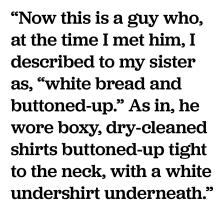 Now this is a guy who, at the time I met him, I described to my sister as, “white bread and buttoned-up.” As in, he wore boxy, dry-cleaned shirts buttoned up tight to the neck, with a white undershirt underneath. As in, he parted his hair on the side and combed it down, like a kid from the Eisenhower era on Picture Day.