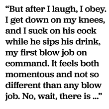 But after I laugh, I obey. I get down on my knees, and I suck on his cock while he sips his drink, my first blow job on command. It feels both momentous and not so different than any blow job. No, wait, there is something different.