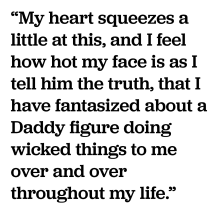 My heart squeezes a little at this, and I feel how hot my face is as I tell him the truth, that I have fantasized about a Daddy figure doing wicked things to me over and over throughout my life.